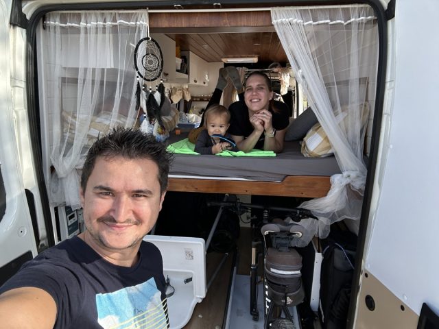 V avtodomu vsi trije spimo skupaj v zadnjem ležišču. Jon spi na sredini, med nama, kar se je izkazalo za praktično in udobno rešitev. Tudi ponoči ga hitro potolaživa, če se zbudi, in ni nobene potrebe po prenašanju, vstajanju ali dodatni postelji (vsaj zaenkrat).